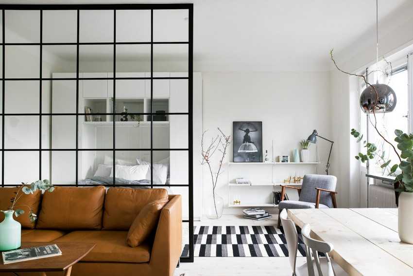 Перегородка с добавлением стекла используется в стилистических дизайнерских решениях, отличный вариант необычного зонирования.