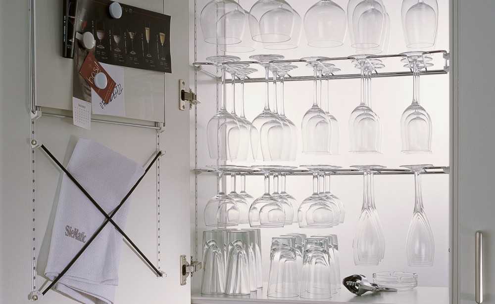 В верхнем ряду шкафы с широкими подъёмными дверками зачастую удобнее обычных, открывающихся в сторону. Доступно большое пространство, соседние дверки не перекрывают друг друга, не мешают человеку. Широкие и невысокие горизонтальные дверки гармонируют с выдвижными системами нижнего ряда, прекрасно вписываясь в модный минималистичный стиль. Единственный недостаток «подъёмников» — немалая цена по сравнению с обычными петлями.