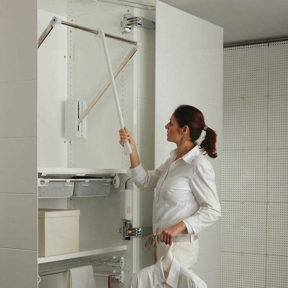 Откидные подъёмники — дверка описывает сложную траекторию, ручка находится невысоко, при этом пространство шкафа хорошо доступно. Шкафы могут быть достаточно высокими, до ручки несложно дотянуться