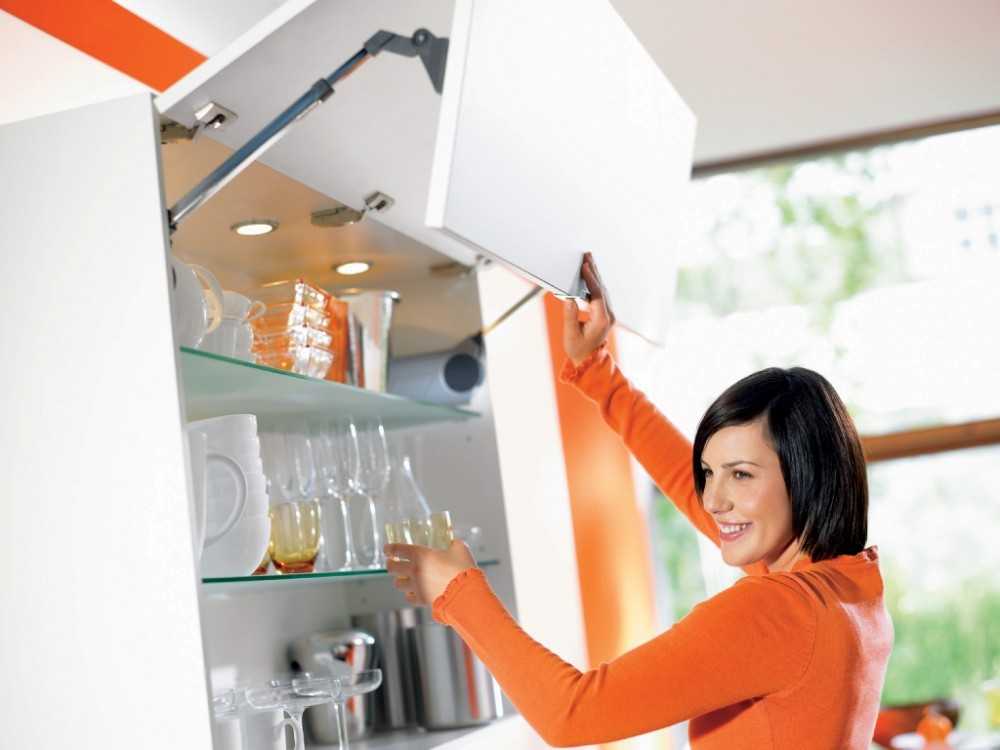 Для человека невысокого роста или при высоких шкафах откидной подъёмник удобнее поворотного либо вертикального: дверная ручка расположена ниже, за ней не нужно тянуться, чтобы закрыть дверку