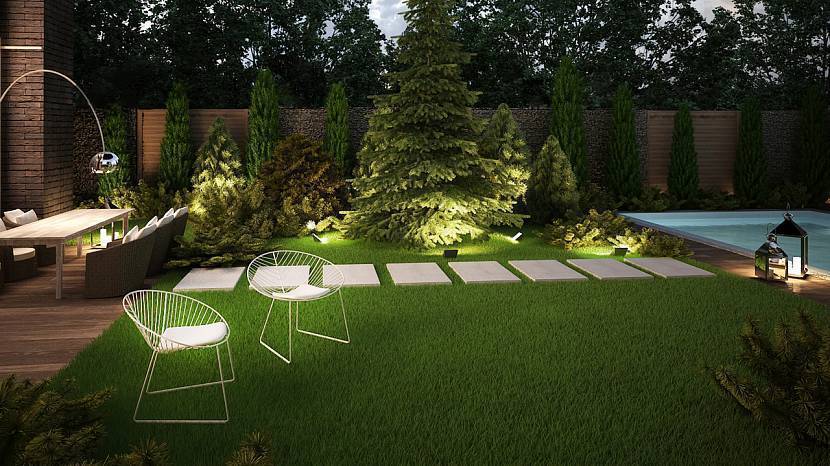 Ландшафтный дизайн с хвойными растениями можно дополнить системой освещения. Это позволит любоваться композицией из хвойных в вечернее время. Перед установкой фонарей следует учесть изменения, которые будут происходить в связи с ростом зеленых насаждений.
