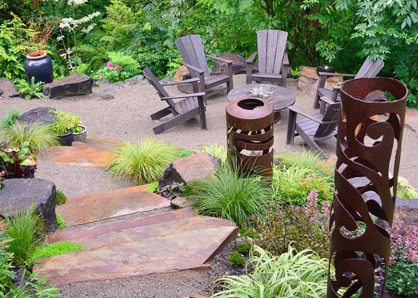 Элементы с плоской поверхностью можно использовать для обустройства летней площадки или патио. Большие валуны из крепких пород (гранит, мрамор) могут стать основой для стола и стульев. Чтобы конструкция была более удобной, каменные сидения можно накрывать декоративными подушками.