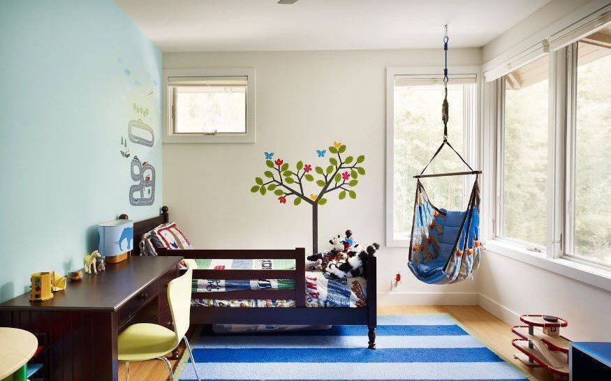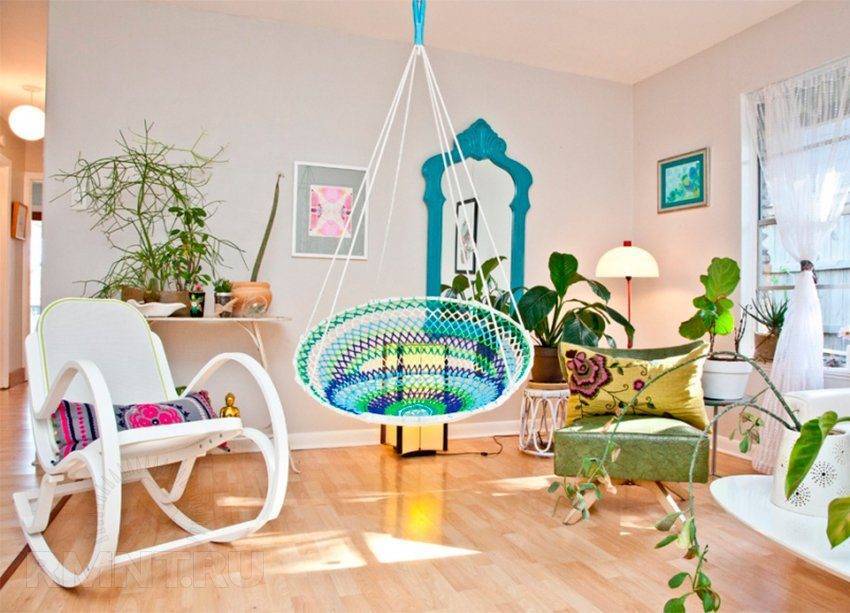 Идея висячей постели нашла применение в других оригинальных конструкциях. В качестве примера можно привести подвесное кресло-гамак, которое, к слову сказать, не так уж и сложно изготовить своими силами.