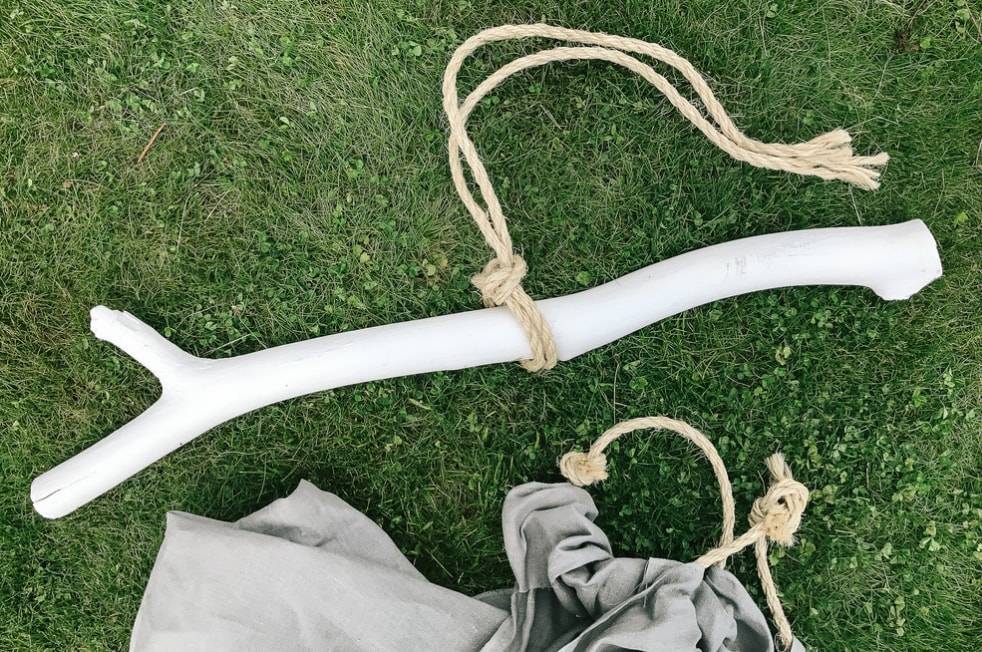 По бокам коряги привязываем заготовку с тканью и подвешиваем ее на дереве. Постарайтесь закрепить конструкцию максимально надежно.