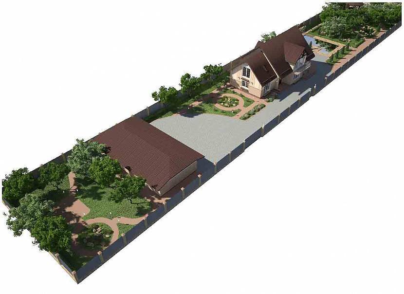 Больше всего придется думать о том, как расположить дом на участке узкой (удлиненной) формы. Часто такие участки встречаются на бывших совхозных или колхозных территориях. Там одна стена дома вообще может выходить во двор соседей – настолько плотно прилегают неширокие участки друг ко другу. Основной принцип расположения дома на такой земле – устраивать все в линию с небольшим смещением к одной и границ территории. Фронтальная часть дома тогда будет смотреть на улицу, где вход на участок. Если улица слишком шумная, тогда фронт помещают на противоположную сторону, а вход в дом – сбоку.