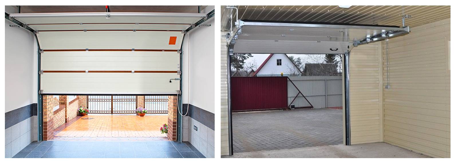 Это конструкция из нескольких секций, расположенных горизонтально и соединенных между собой специальными петлями. С помощью подъемного механизма, находящегося на потолке, ворота поднимаются по направляющим профилям и располагаются горизонтально вдоль потолка. Секции в основном изготавливают из сэндвич-панелей.