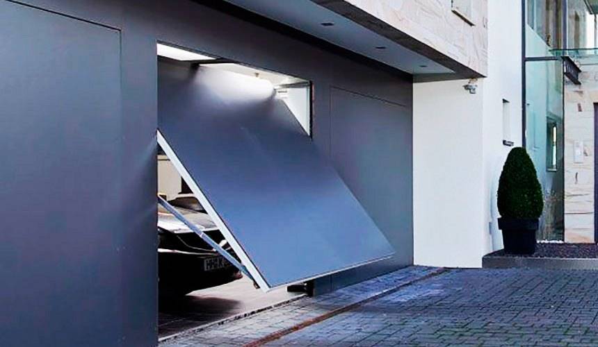 Чисто конструктивно это цельный щит, который собой закрывает весь въездной проем. Для открытия ворота поднимаются и поворачиваются на 90° так, чтобы они оказались вверху в горизонтальной плоскости. Для этого используется система рычагов, редуктор и электродвигатель.