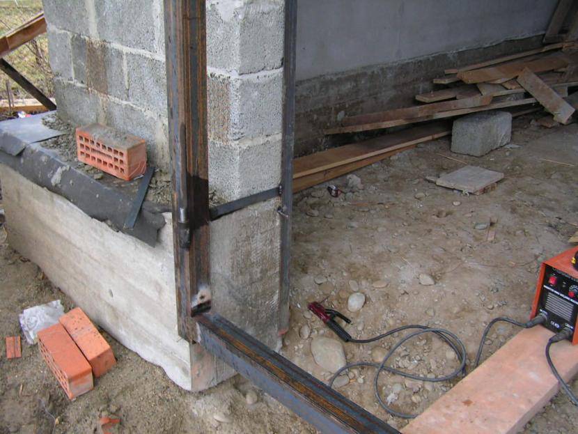 Одну часть рамы прикладывают к стене и, пока один надёжно фиксирует её, второй просверливает в металле отверстия для монтажа арматуры. Ширина проёмов должна быть на 1 мм больше диаметра металлического прута. Через отверстия маркируют точки в стене, которые потом просверливают перфоратором. Вновь приложив часть каркаса к проёму, при помощи молотка арматуру забивают в подготовленные отверстия. Арматуру по кругу приваривают к раме и обрезают выходящую часть при помощи болгарки. Все сварочные швы тщательно зашлифовывают.