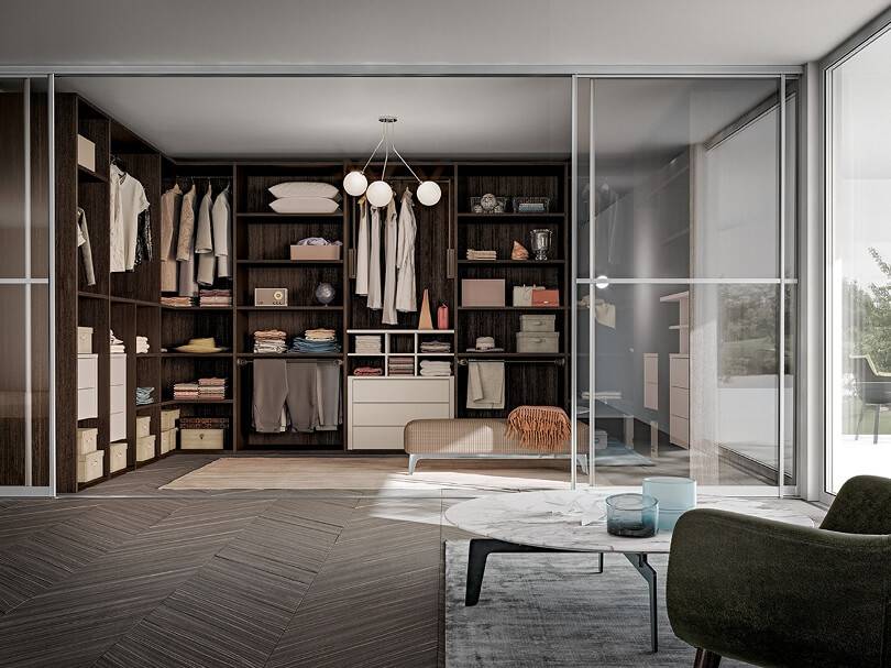Встроенная гардеробная в нише – наименее затратный способ обустройства, так как три стены уже есть, значит, понадобится только перегородка либо шторка. Лучше всего в современную спальню впишутся стеклянные двери-купе, декорировать их можно на любой вкус.