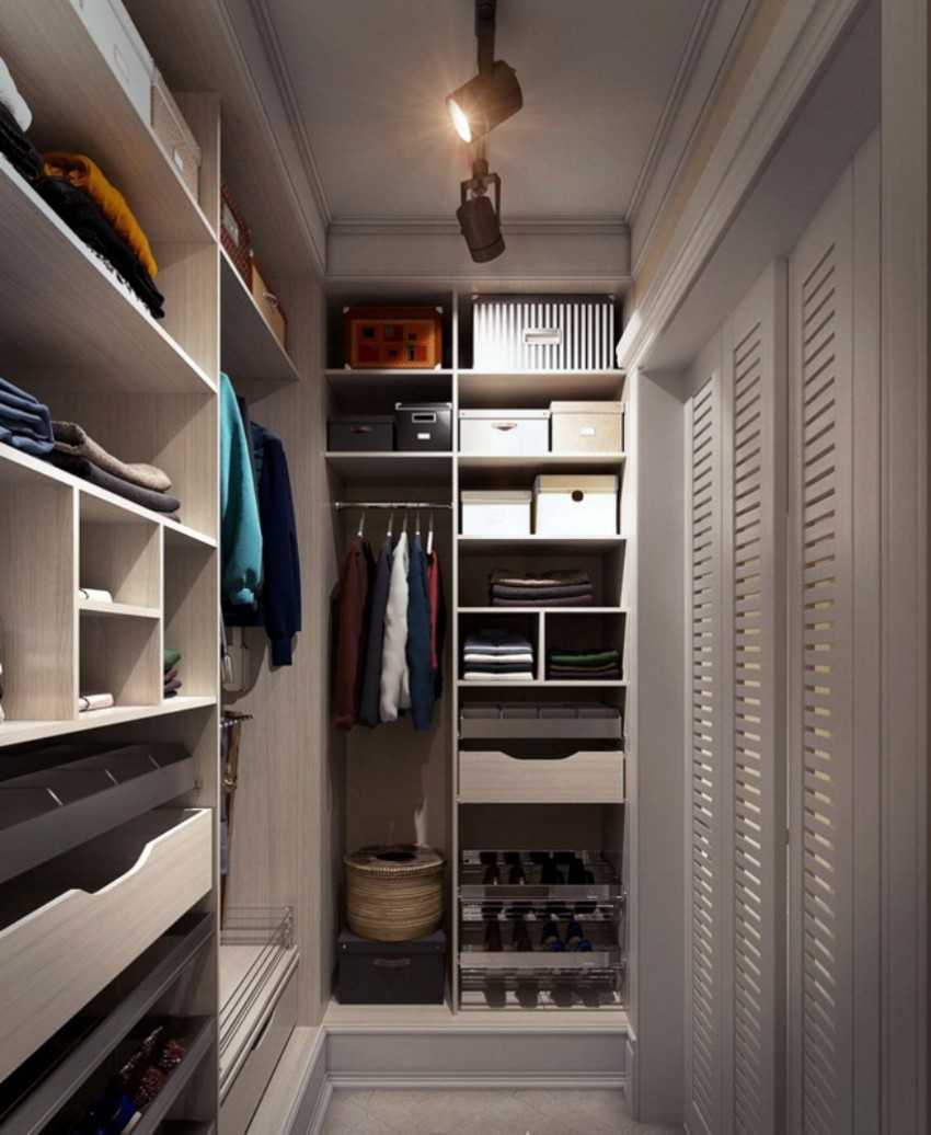 - гардероб в отличие от других комнат вы можете по максимуму заставить шкафами, полками, вешалками, использовать каждый сантиметр пространства с пользой;