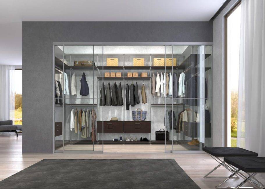 Комнату можно при желании поделить на мужской, женский, детский отделы. В результате подобного решения будет легко и просто найти нужный предмет гардероба за короткое время.