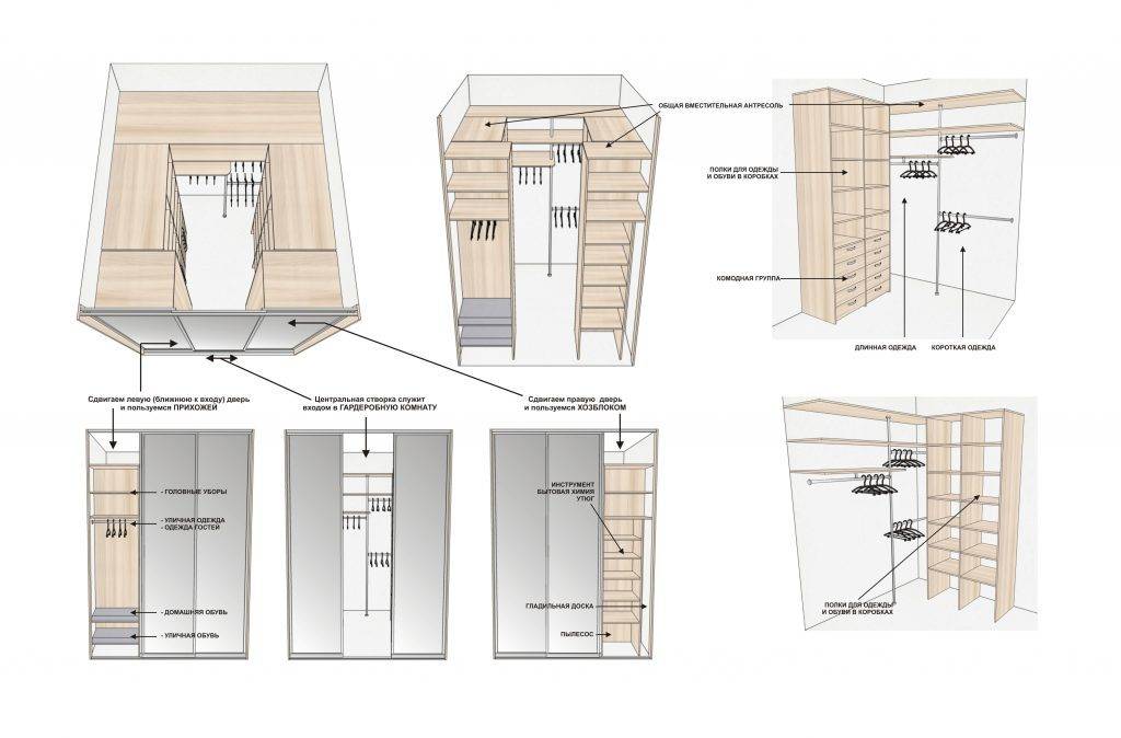 Если вы решили в своём жилище выделить место под гардеробную комнату, для начала нужно создать эскиз. Он включает такие параметры как ширина и высота, наполнение и дизайн конструкции.