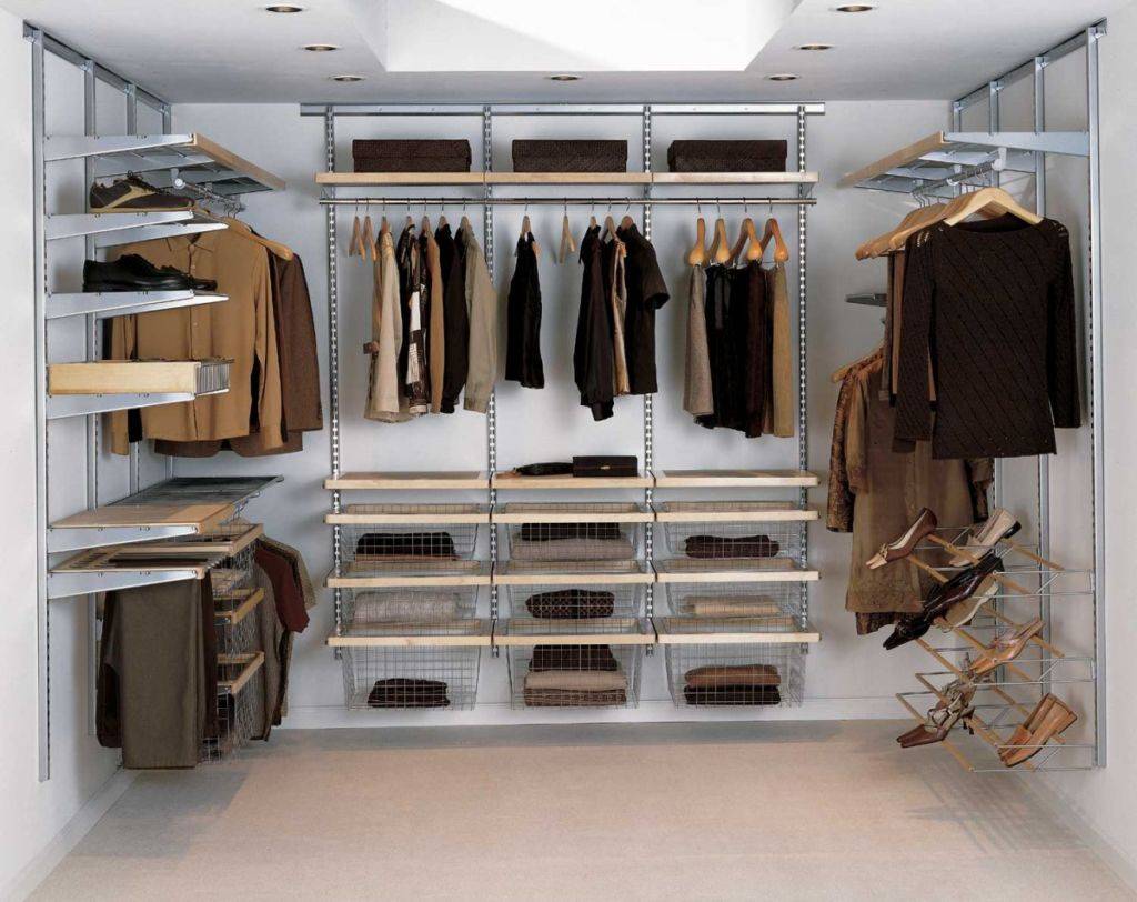 Для небольшой гардеробной в кладовке, стена которой выходит в спальню, стоит установить несколько открытых полок под сложенные вещи — джемпера, свитера, футболки и т.д. Менее громоздки и более удобны проволочные ящики или полки. Они экономят пространство, к тому же лучше видно, что в этих ящиках/полках лежит.