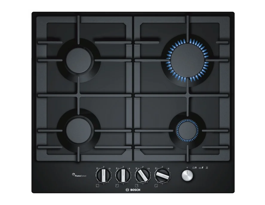 Популярная панель PCP6A6M90R от компании Bosch визуально и характеристиками почти полностью соответствует рассмотренному выше решению производства Сименс. Даже габариты здесь совпадают до миллиметра. Зато данный вариант можно найти дешевле, а из других его плюсов можно отметить кнопку блокировки панели, что не слишком часто встречается в газовых моделях. Слегка изменённая решётка с дополнительными рёбрами также отмечается пользователями в качестве одного из достоинств газовой варочной панели PCP6A6M90.