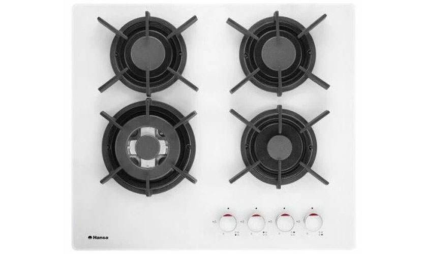 4-конфорочная газовая варочная панель с панелью из закалённого стекла. Корпус техники выполнен в светлом цвете, стоит отметить что после готовки поверхность отмывается не так уж и легко, а пачкается она при каждой готовке. Из 4 газовых конфорок разного размера, одна это WOK-конфорка, она отличаются от обыкновенных тройным пламенем, а также специальным адаптером для посуды, который входит в комплектацию, эта модель сразу отличается от двух предыдущих количеством конфорок. Переключатели поворотные, находятся спереди справой стороны. Печь оборудована системой газ-контроль и функцией электроподжига. Верхняя решётка сделана чугуна. Размеры: высота – 9,8 см, ширина – 56см, глубина – 48см , а вес равен 10 кг.