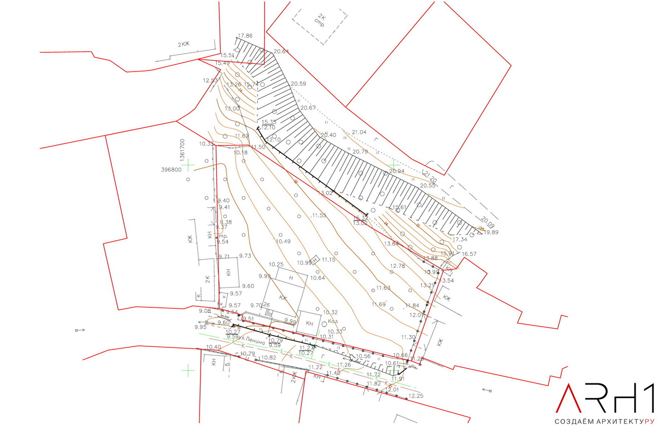 Имеющиеся строения, обозначенные выше на топографической съёмке, идут под снос, здоровые растения определяем по месту и сохраняем по возможности.