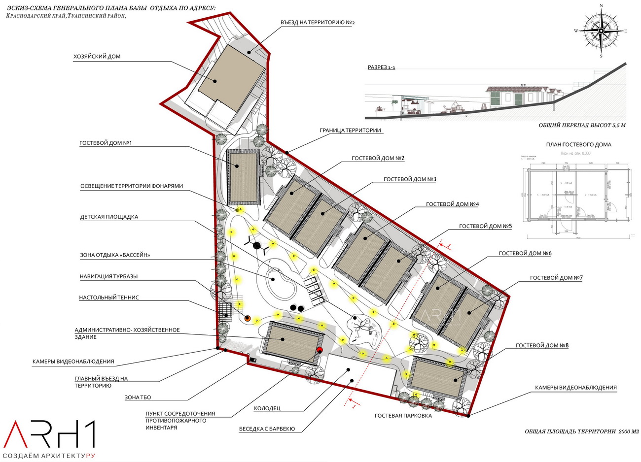 Рельеф участка горный с перепадом высот 5,5 м. Всю геопластику территории максимально сохраняем, вписывая строения в существующий рельеф.