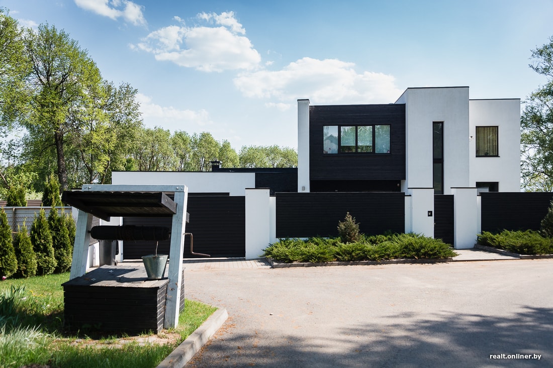 Необычный дом выделяется на фоне однотипной деревенской застройки. Г-образное расположение здания разделило функциональные назначения пространств. Одно крыло занимают приватные и гостевые комнаты, второе отдано под спорт.
