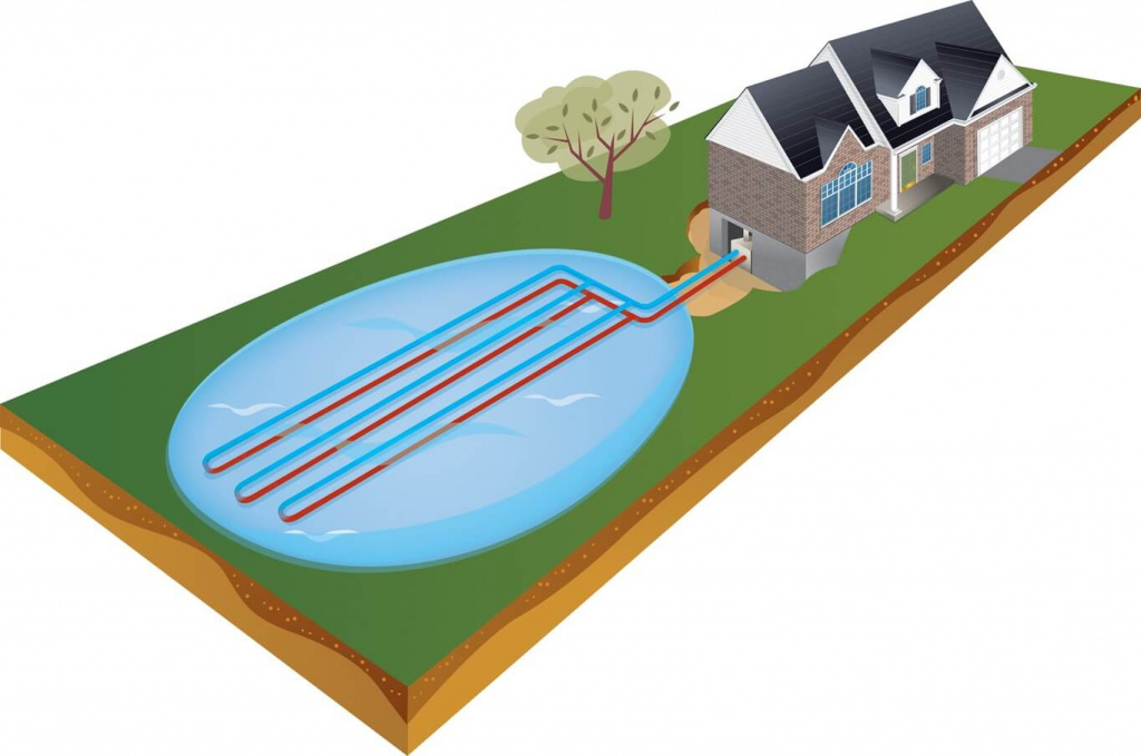 Установить такой вид геотермального отопления полностью своими руками не получится, так как потребуется специальное оборудование для бурения скважины — водоразмещенный обменник является самым экономичным способом, он использует тепловую энергию воды. Его использование возможно, если до водоема не более 100 м.