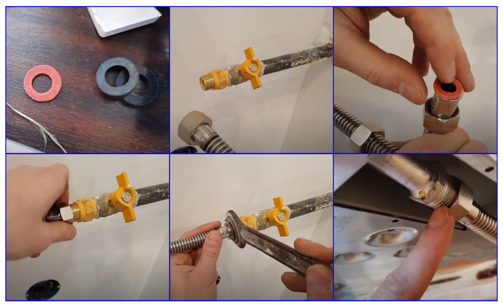 На штуцер шланга накладывают уплотнитель и закручивают его в кран на отпуске. Если диаметры не совпадают, то нужен переходник, который также уплотняют. Рукав подсоединяется к котлу.