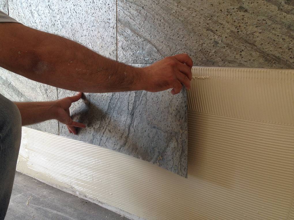 Непосредственный монтаж гибкого камня на поверхность начинается с верхней части левой стороны. В случае образования небольших трещин их сразу же заделывают, используя грунтовку на акриловой основе. После того поверхность затирается гибким камнем.
