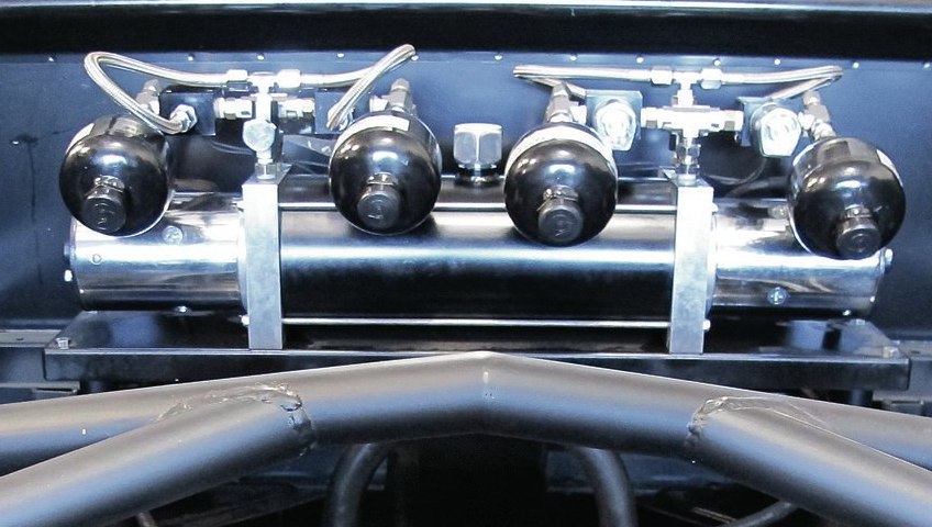 Монтируется гидроаккумулятор в непосредственной близости от заднего левого колеса на рукаве. Сверху агрегат закрыт тонкостенным кожухом, внутри которого находится подвижной цилиндр, поршень, зафиксированный на штоке, подсоединённом к передней крышке, и пружина, поджимающая цилиндр.