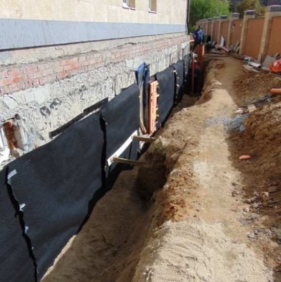 Перед выполнением работ по устройству гидроизоляции проводят ряд мероприятий по отводу влаги от несущих конструкций здания и делают дренаж. Далее в два этапа укладывают материал, препятствующий поднятию капиллярной влаги в наружных стенах.
