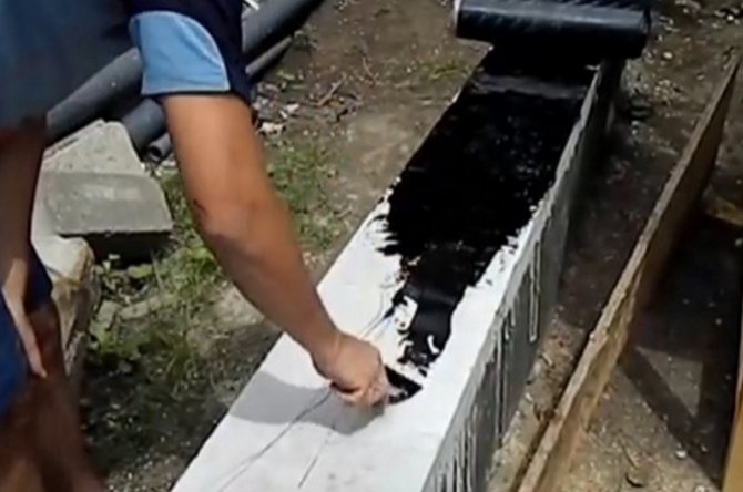 Покрывают предварительно нагретой до жидкого состояния битумной мастикой. Если состав слишком густой, мазать его трудно, добавляют небольшое количество растворителя или бензина, чтобы получить нужную консистенцию