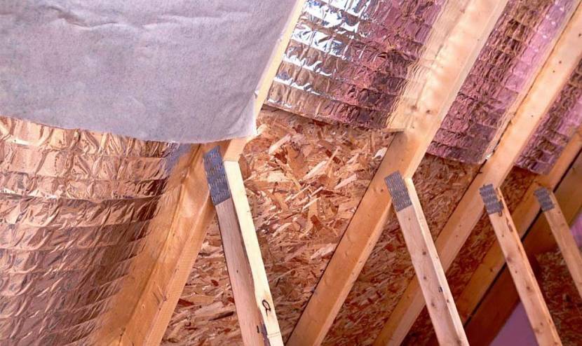 Если слой теплоизоляции неплотный, рулонное полотно фиксируют при помощи реек, которые в обязательном порядке антисептируют.