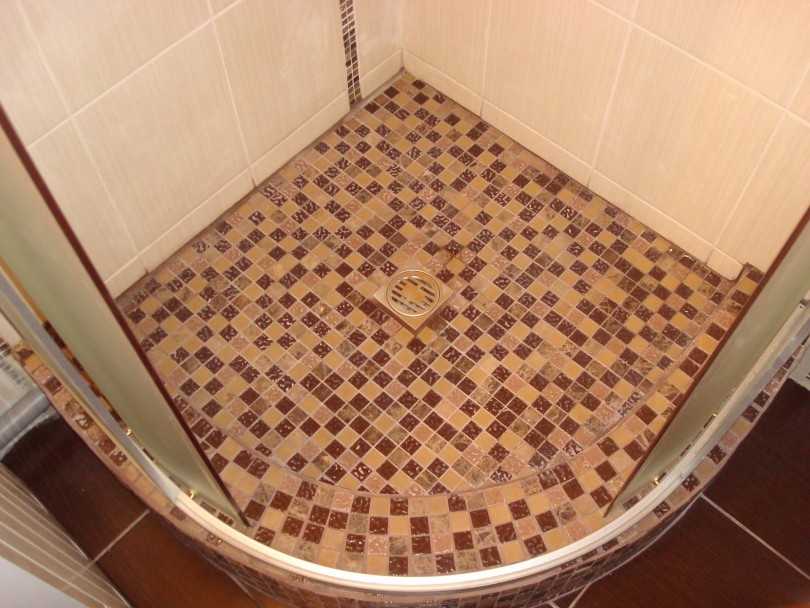 Если вы приобрели кабинку без поддона, то пол облицовывают керамикой, не забыв оставить стоки свободными. Их следует надежно герметизировать цементным раствором. При этом необходимо выдержать небольшой уклон в сторону сливного отверстия.