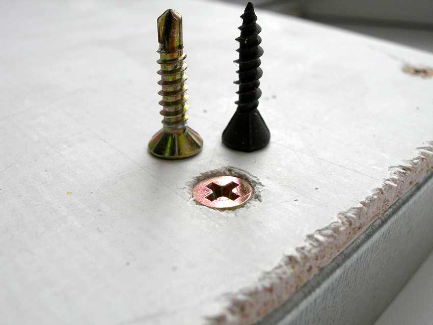 Производители рекомендуют монтировать листы при помощи специальных саморезов с маркировкой «по гипсоволокну». Главное отличие от обычного крепежа состоит в присутствии шляпки с более острым конусом, которая позволяет проникать креплению вглубь листа без предварительного засверливания. Длина самореза должна быть в 3 раза больше толщины используемой плиты.