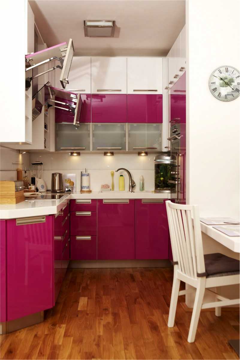 - цвет гарнитура будет спокойным, не слишком ярким и вызывающим. Белые, бежевые, цвета слоновой кости глянцевые кухни – самые красивые и гармоничные;