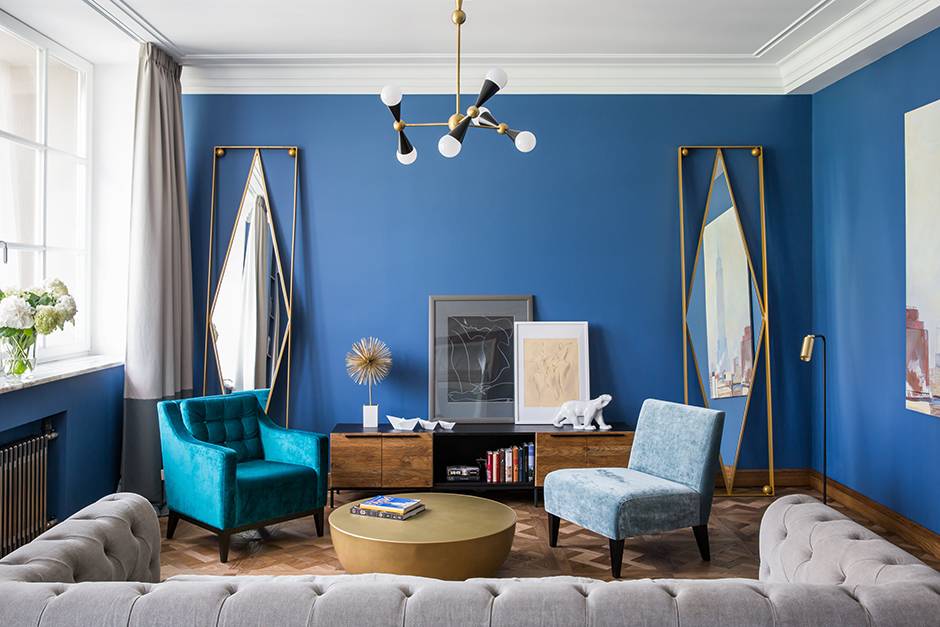 Говорят, что синий — это цвет индивидуалистов и отдельных творческих людей. Это касается всех оттенков синего. Ярко-синий будет хорош для небольших помещений, требующих оптического расширения. В свою очередь, темно-синий, подойдет для больших гостиных , а также в виде цветового акцента на единой стене. Море или бирюза — глубокий оттенок синего, он хорошо подойдет в квартире творческих людей, которые любят окружать себя художественным беспорядком и необычными предметами.