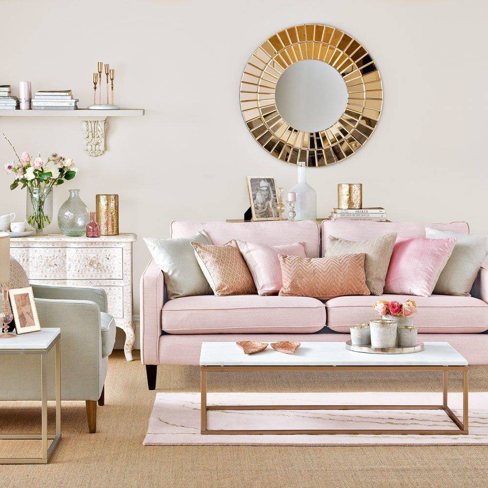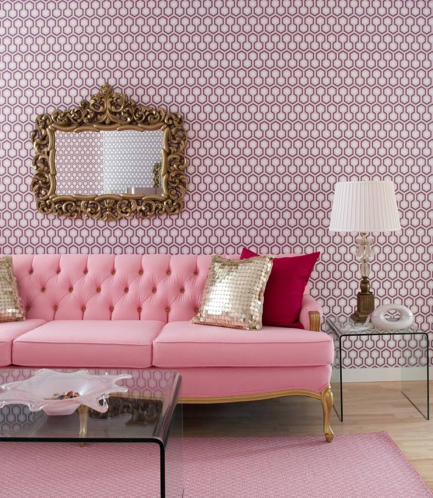 Это совершенно другое, когда вы выбираете интерьер гостиной в стиле гламур. Данный дизайн требует интенсивных цветов, поэтому можете успешно сочетать, например, стены цвета фуксии с мебелью и аксессуарами в розовом. Здесь также стоит использовать розовое золото, которое придаст интерьеру еще более роскошное оформление. Зеркальные рамы, подсвечники или светильники могут быть металлическими, не забудьте про декоративные подушки. Текстиль из розового золота должен максимально сиять и напоминать драгоценный металл, поэтому выбирайте такие ткани, как парча, шелк, атлас или варианты расшитые пайетками.