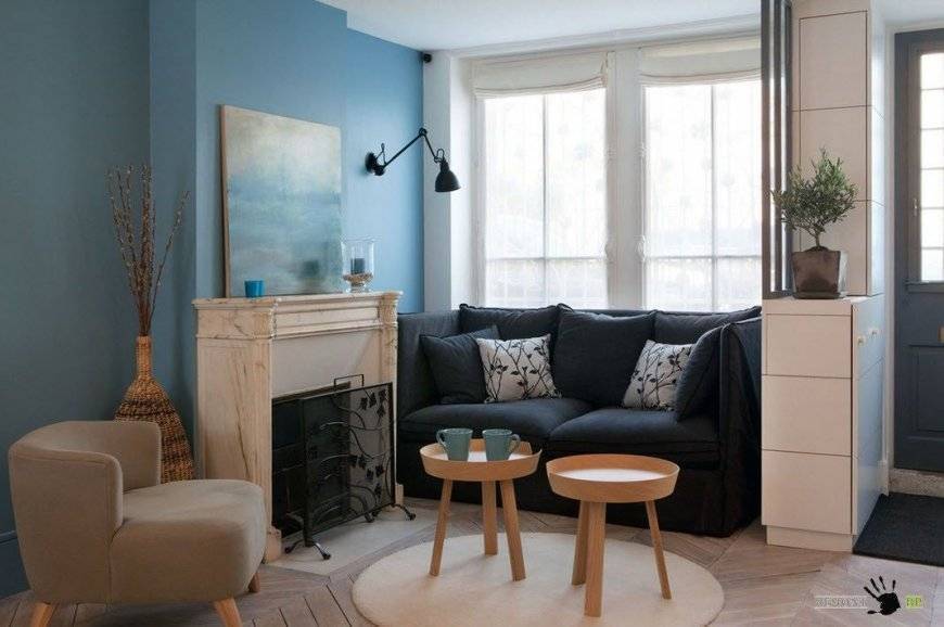 Тут важно подобрать именно теплые оттенки синего или черного. Темные оттенки сделают мрачную комнату еще более мрачной