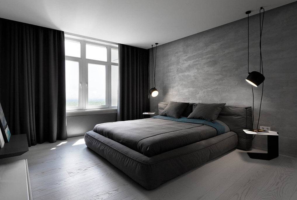 Если все стены отделаны серым, то акцентами выступают шторы, подушки, покрывала, обивка кресел бирюзового или василькового оттенков.