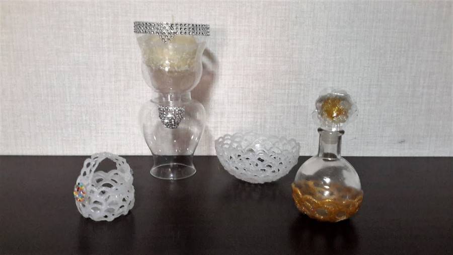 Интересным видом обладают поделки из ниток и клея, которые покрывают, например вазу слоем разноцветных нитей, а клей используется как связующее вещество.