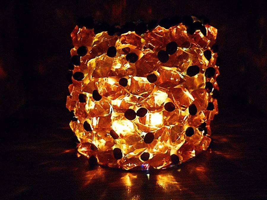 Выбирайте широкую емкость, которую будете использовать в качестве подсвечника, так как температура горящей свечи может расплавить клей, что несомненно испортит изделие.