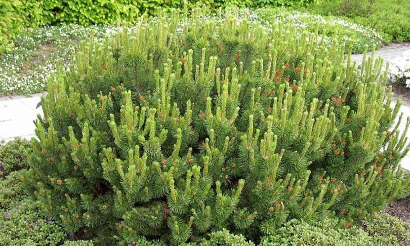 Pinus mugo mughus — что в длину, что в ширину вырастает примерно одинаковых размеров (до 2-3 м), ежегодно прибавляется около 10 см. Иглы посажены густо и собраны в пучки по 2 штуки, каждая из которых достигает 4 см. Шишки начинают образовываться только спустя 6 лет. Во время сильной жары нуждается в регулярном поливе. Растет в любой почве, не привередлива.