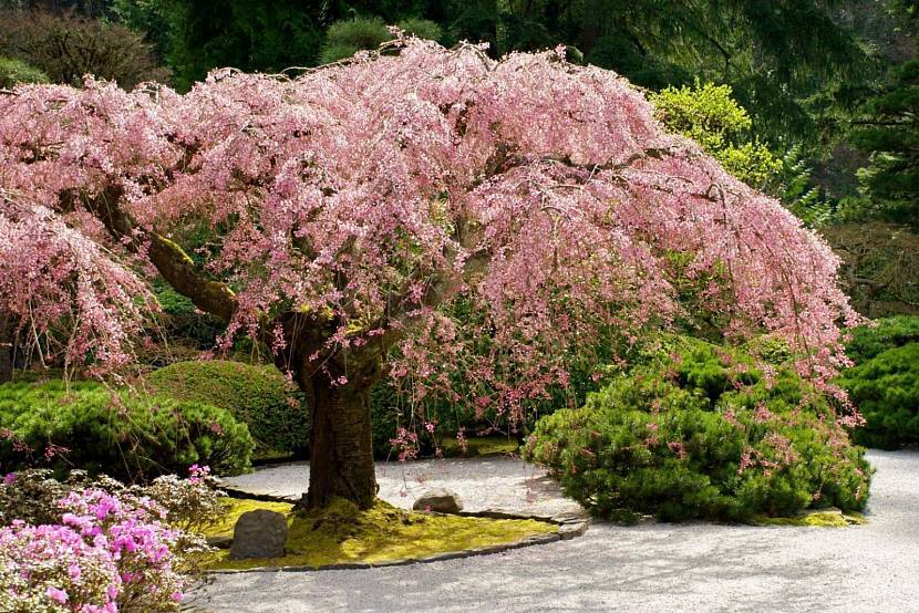 Сакура (японская вишня) – самое красивое декоративное дерево для сада. Применяется в одиночных (солитерных) и в художественных композициях. Отлично сочетается с каменистыми склонами, стенками. Даже небольшое, высотой в 1 м, деревце доставит гордость владельцу. А взрослое, достигшее 2,5-3 м. и вовсе будет словно розовое, благоухающее облако.
