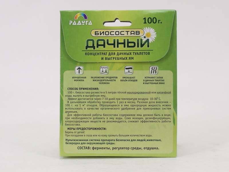 Идеальное экосредство для выгребных ям. Продукт создан для быстрого и качественного расщепления жиров, белков, мочевины и целлюлозы. Быстро разбивает все продукты жизнедеятельности человека. Биоактиватор подойдет для разных видов выгребных ям. Хорошо работает как в яме с герметичным, так и с открытым дном. Особый состав товара отличается активной борьбой с неприятными запахами и заливанием, которые могут доставить много хлопот пользователям дачных туалетов. Формула препарата считается безвредной для окружающей среды и человека, потому что не содержит в себе опасных и едких химикатов.