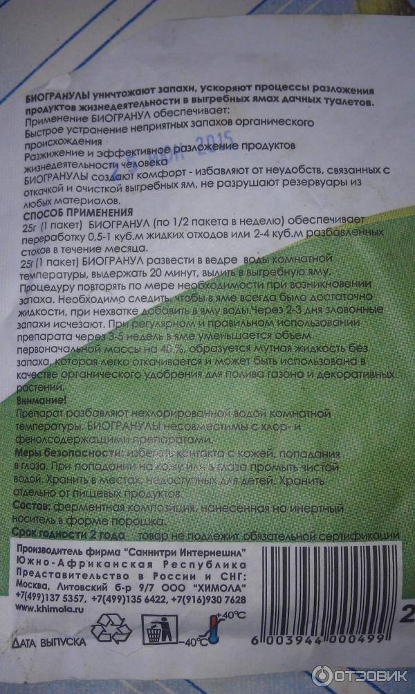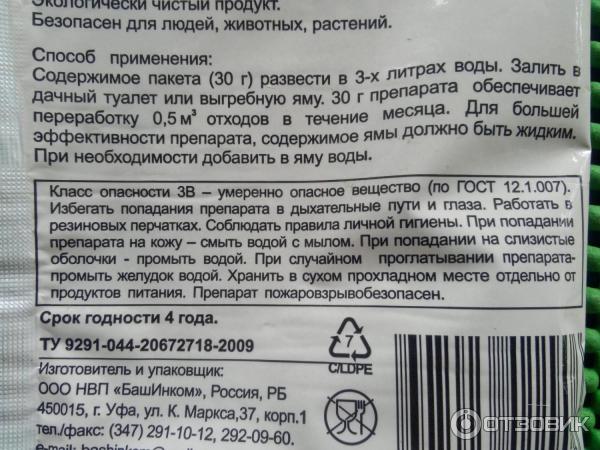 В содержимом ямы обязательно наличие жидкости. Если ее мало, доливают в емкость воду. Переработанные отходы не представляют опасности для экологии, их можно смешивать с компостом. Биосредство не предназначается для очищения канализационных труб, его применяют в очистных установках для устранения смрада и разложения органики, фекалий.