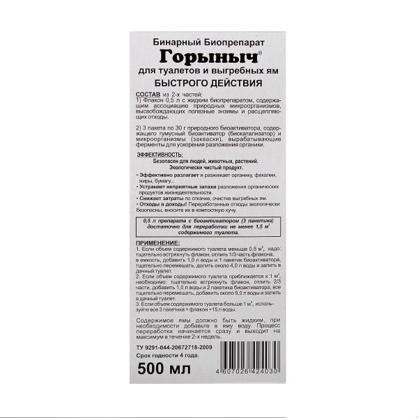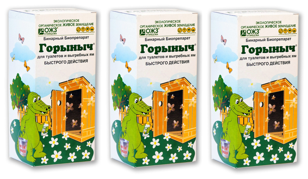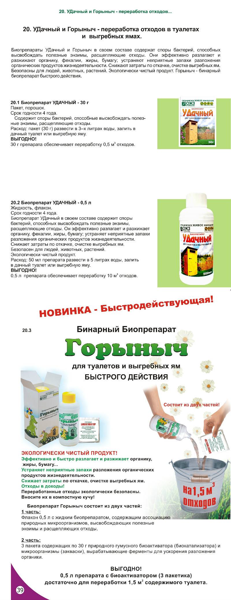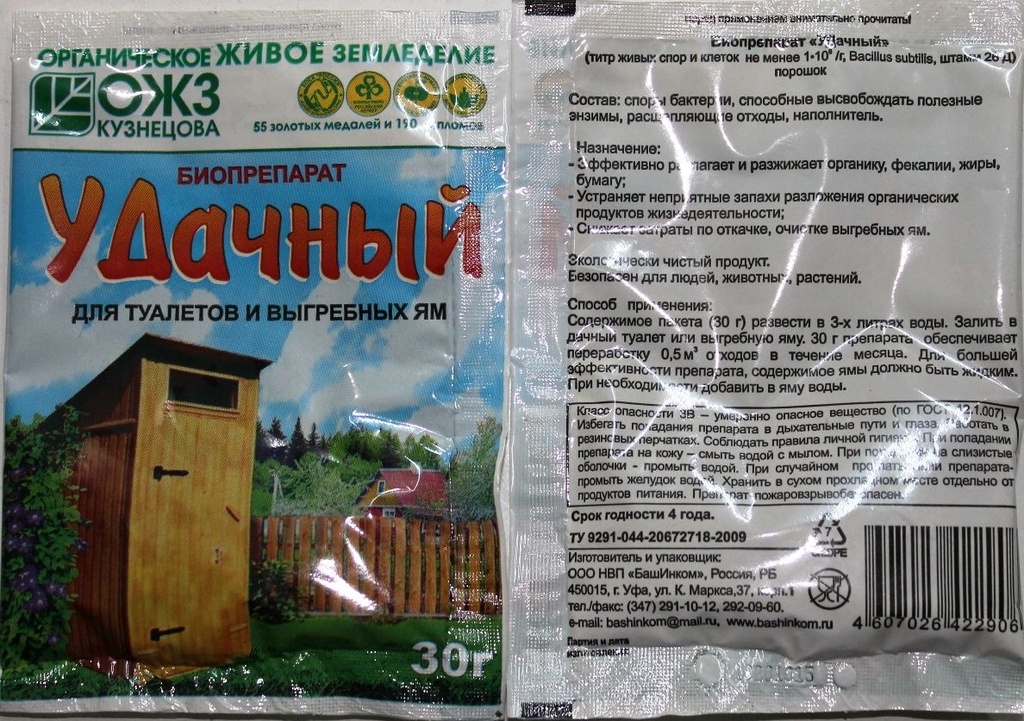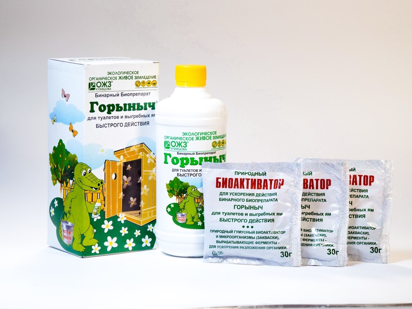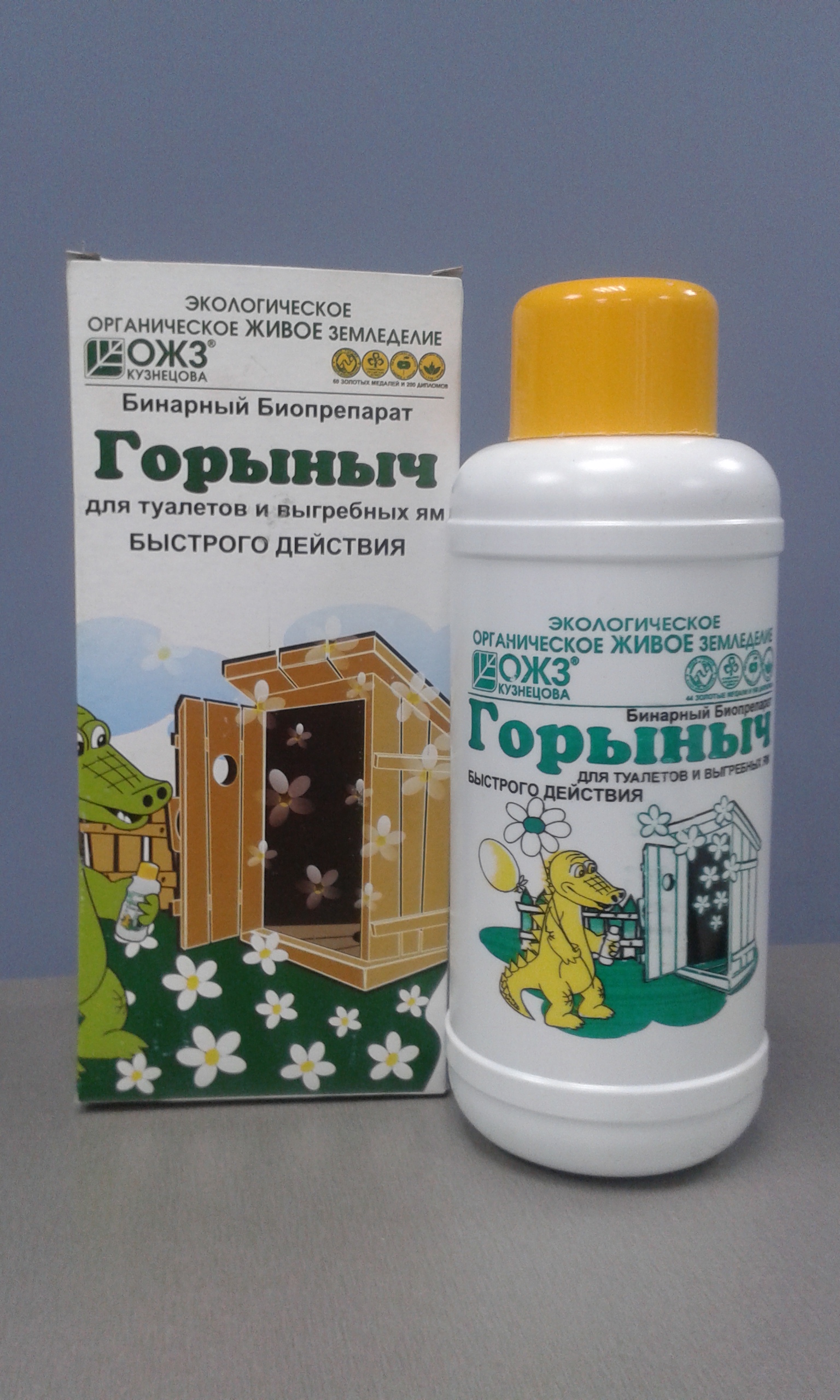Биопрепараты «УДачный» и «Горыныч» в своем составе содержат споры бактерий, способных высвобождать полезные энзимы, расщепляющие отходы. Они эффективно разлагают и разжижают органику, фекалии, жиры, бумагу; устраняют неприятные запахи разложения органических продуктов жизнедеятельности. Снижают затраты по откачке, очистке выгребных ям, безопасны для людей, животных, растений. Экологически чистые продукты. «Горыныч» — бинарный биопрепарат быстрого действия, как и «УДачный», добросовестно служит хозяевам четыре года – именно такой срок годности препаратов. А использовать их очень просто: следует развести 30 граммов порошка (или растворить жидкость) в трех литрах воды и залить полученным раствором дачный туалет или выгребную яму. И быстро, и незатратно, и выгодно – вам и соседям по участку! Никакого неприятного запаха в туалете после этого не останется.