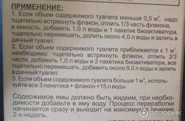 | Кубометр | Встряхните флакон, отлейте две трети флакона, добавьте литр воды и два пакетика биоактиватора. Перемешайте, долейте девять литров воды и залейте в дачный туалет. |