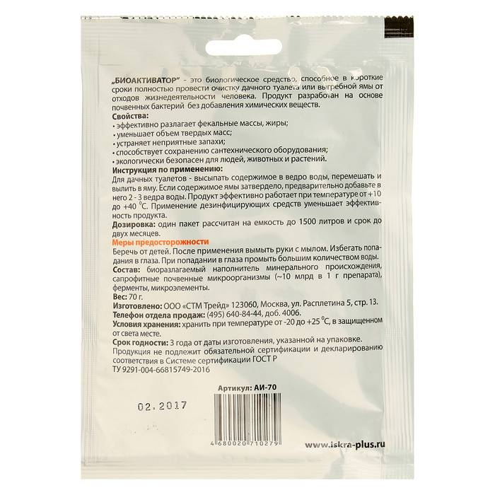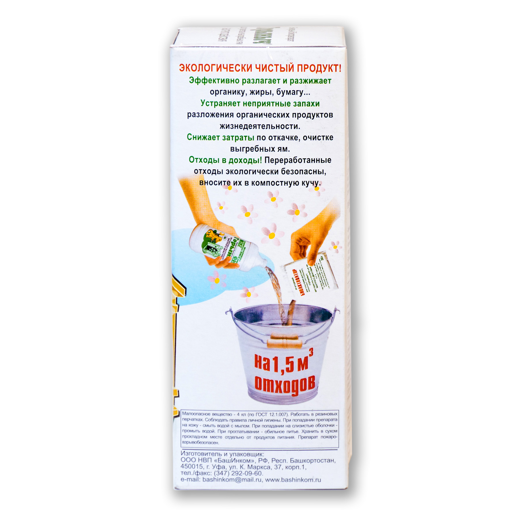 - Трех пакетиков по 30 граммов с биологическим активатором, в составе которого содержатся особые закваски. Они вырабатывают ферменты, необходимые для быстрого расщепления органических соединений.