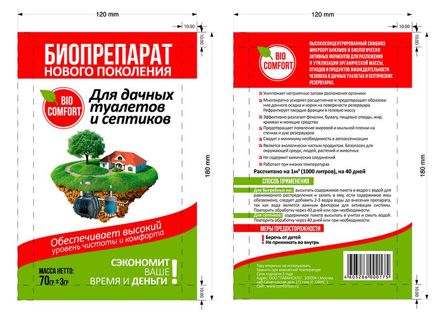 Концентрированная доза продукта поможет справиться с засорами и неприятными запахами как в туалетах, так и в выгребных ямах и септиках. Регулярное использование избавит от необходимости постоянно прибегать к помощи откачки и прочистки. Формула предотвращает нарастание отходов и жира на стоках и канализационной системе. Одно использование концентрата поможет в обработке отходов в течение месяца. Производитель предлагает растворить закрытый пакет в большом количестве воды и вылить полученный раствор в выгребную яму. Препарат действует приблизительно 3 дня, после чего неприятный запах устраняется. Для очистки септика полученную смесь нужно выдержать в течение 20 минут и залить во все трубы в квартире на ночь.