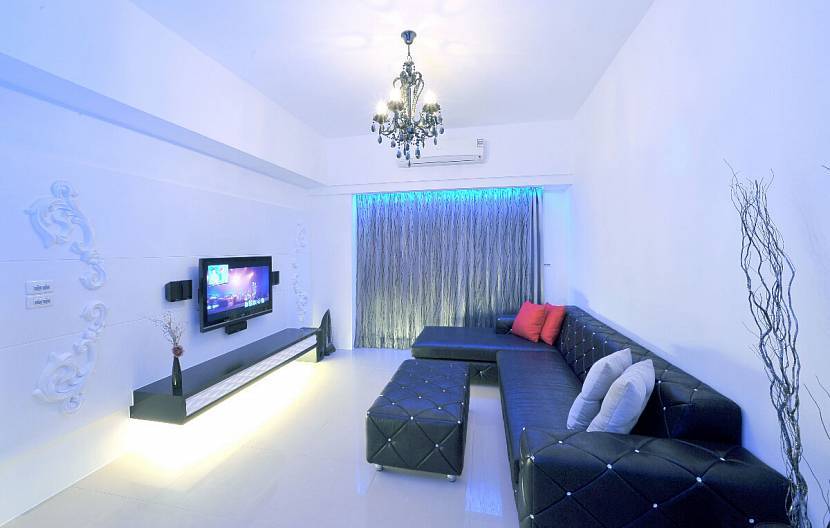 Очень красиво будет выглядеть подсветка потолка в белой гостиной комнате
