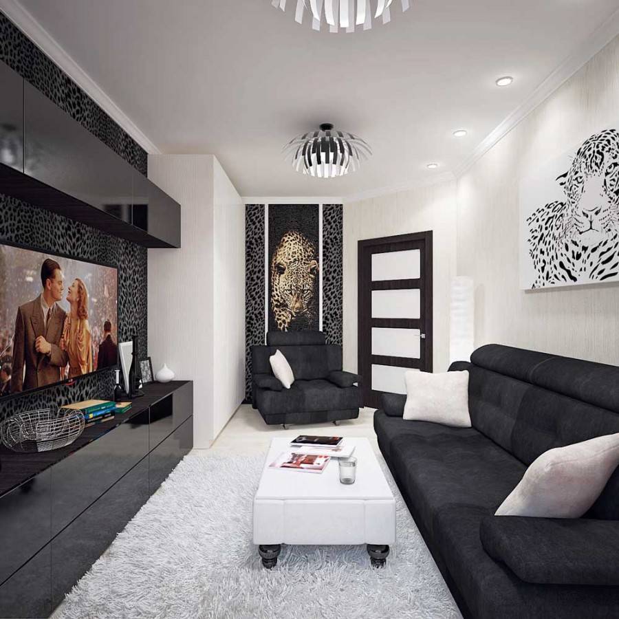 Сочетание белого и черного гостиной в интерьере гостиной выглядит современно