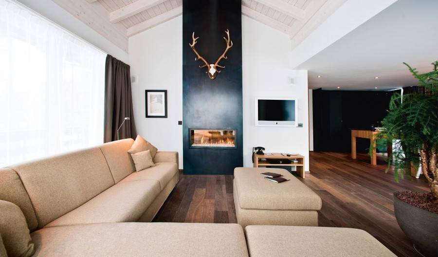 Зона для просмотра ТВ – это большой телевизор, мягкая мебель, столик. Тут можно принимать гостей или обустроить игровую, кабинет, как в обычной квартире. Каминная зона – более серьезный вариант, где есть кресла, столик. Здесь создают атмосферу спокойствия, неспешных бесед. Переход из одной зоны в другую плавный, без резких границ, фактур, цвета.