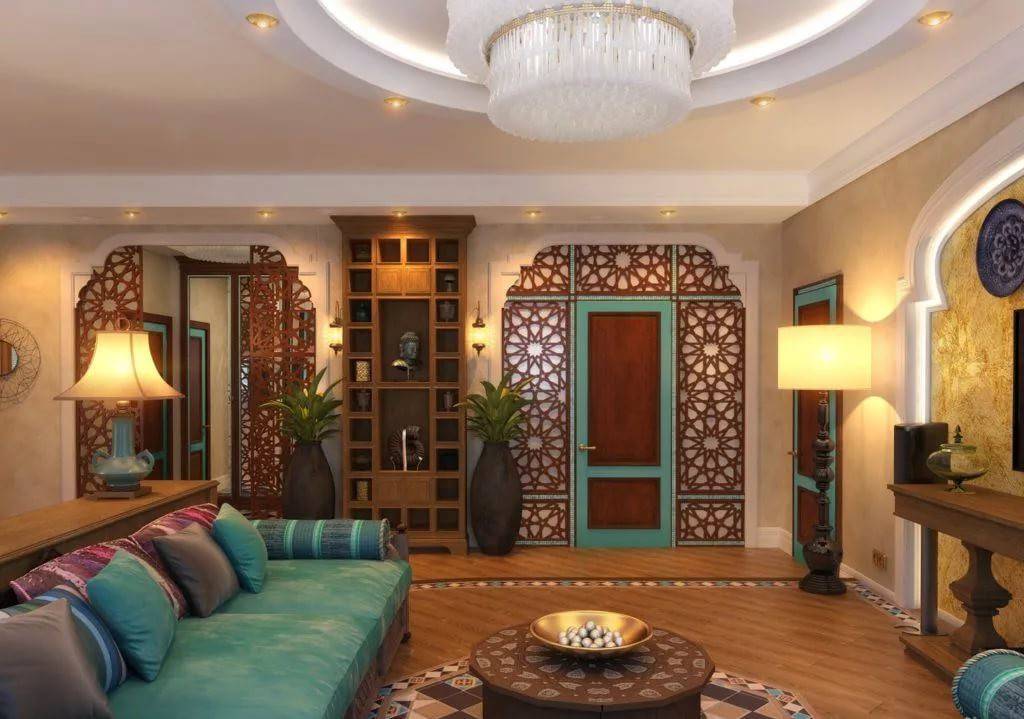 Восточные и колониальные мотивы воплощаются в комнате 30 м². легко, а выглядят органично и изящно. Интерьерная композиция с ее яркими оттенками и стилизованной наполненностью выглядит позитивно каждый день.